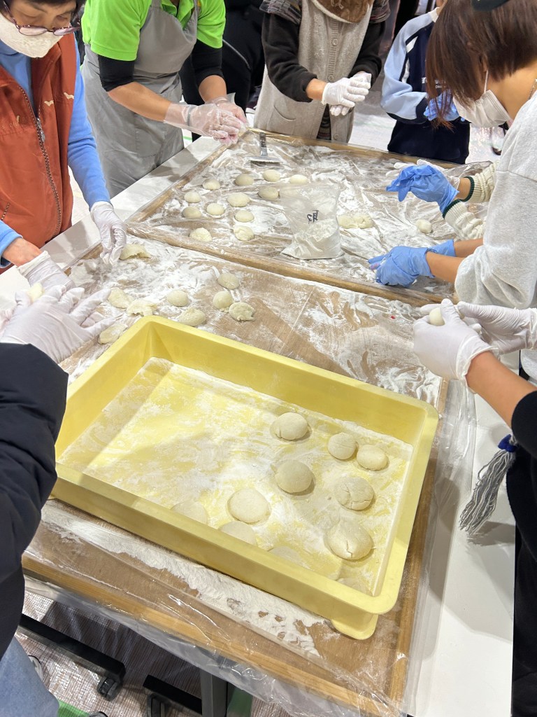 朝は書類仕事をしてから、地域のもちつきを手伝いに行く。雨の中でも体育館で開催している。いつもの地域の人たちに加え、ベトナムから来た技能実習生も一緒にもちを丸めていた。
