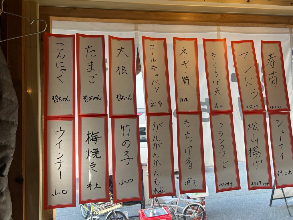 用意したメニュー用の紙に、みんなに筆ペンで「持参したおでん種と名前」を書いてもらった。がんも、白ネギ、春菊、チーズ入りウィンナー、ロールキャベツなど、鍋が山盛りになった。