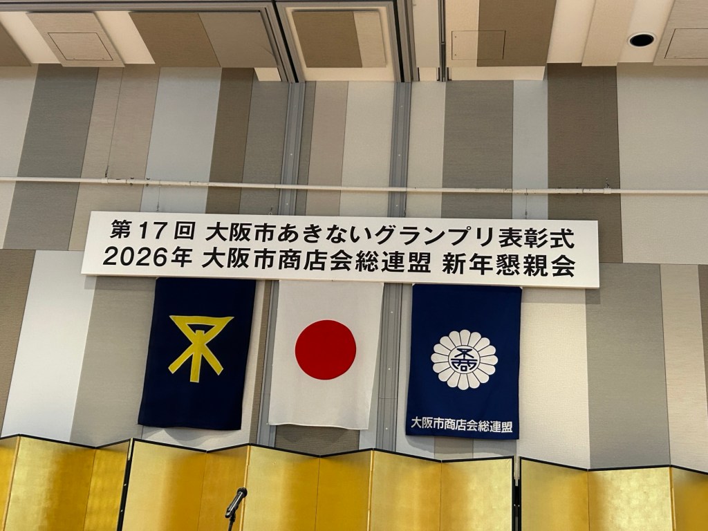 午後からレクがあり、メールで複数案件の調整をし、決裁をする。あっという間に出かける時間になり、担当課長と慌てて降りる。公用車で難波のホテルに向かう。大阪市商店街連盟の「大阪あきないグランプリ」の表彰式と新年互例会に出るからだ。ほとんどの区長が来ている。