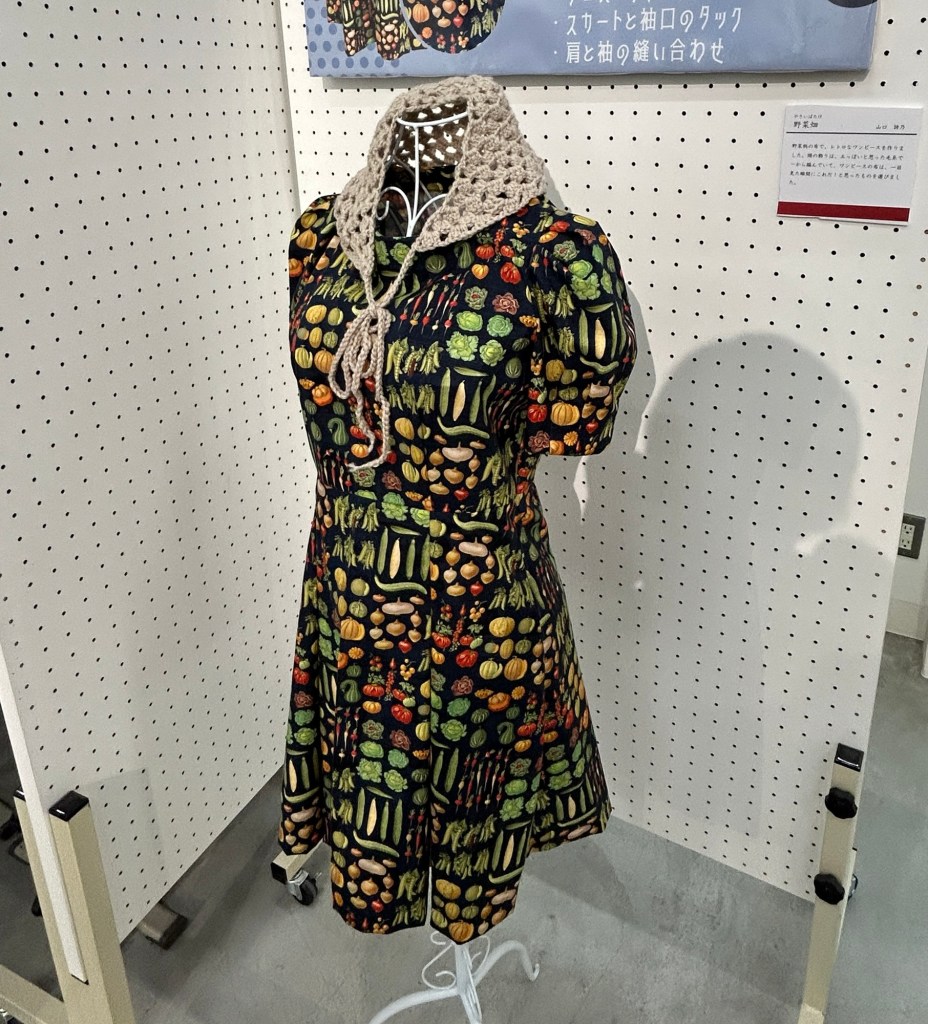 卒業制作展の最終日、娘に案内してもらった。日記を書き始めた頃に「卒業制作でワンピースをつくると言い出した、絶対に手伝わされる」とビビっていたが、たまにミシンの不調を聞かれるぐらいで野菜柄のワンピースとニットのヘッドドレスを仕上げていた。