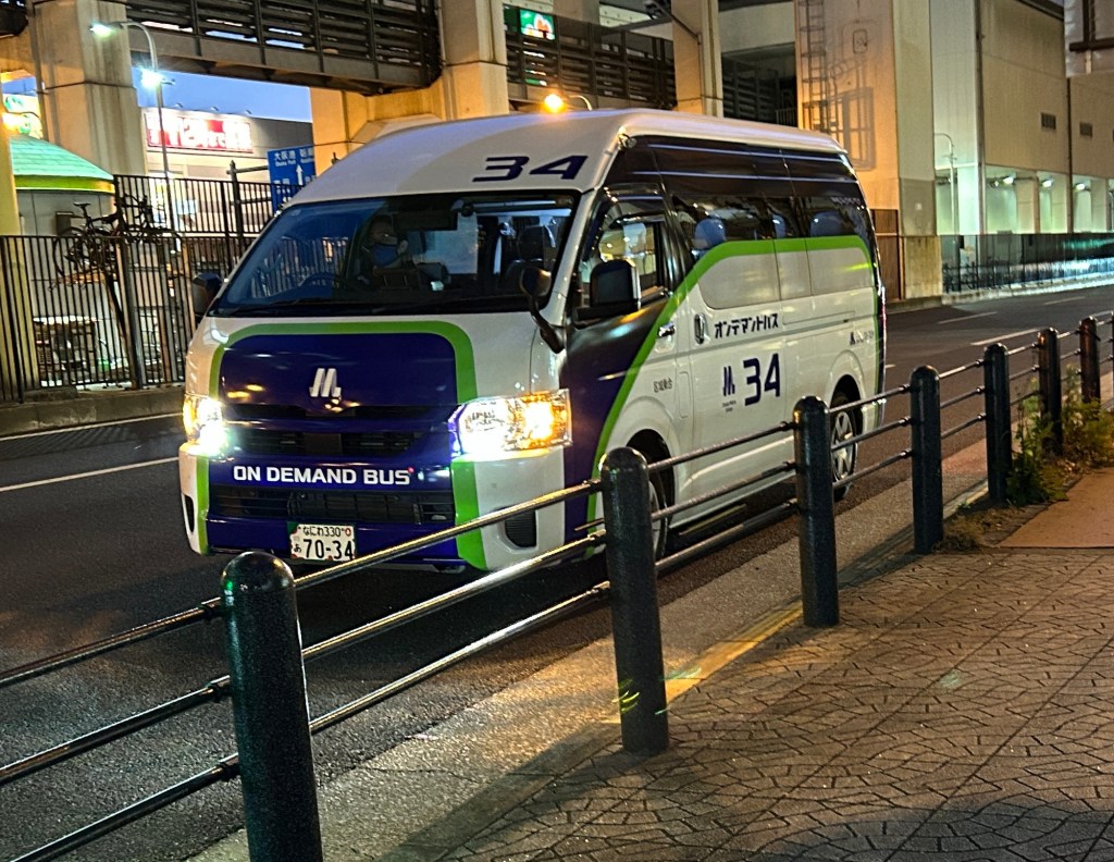 オンデマンドバスをメトロ弁天町駅そばのバス停に呼ぶ。乗りたいのに、シティバスがバス停をふさいでいる。予約時間になり、運転手はバス停より後ろの位置でオンデマンドバスのドアを開けた。