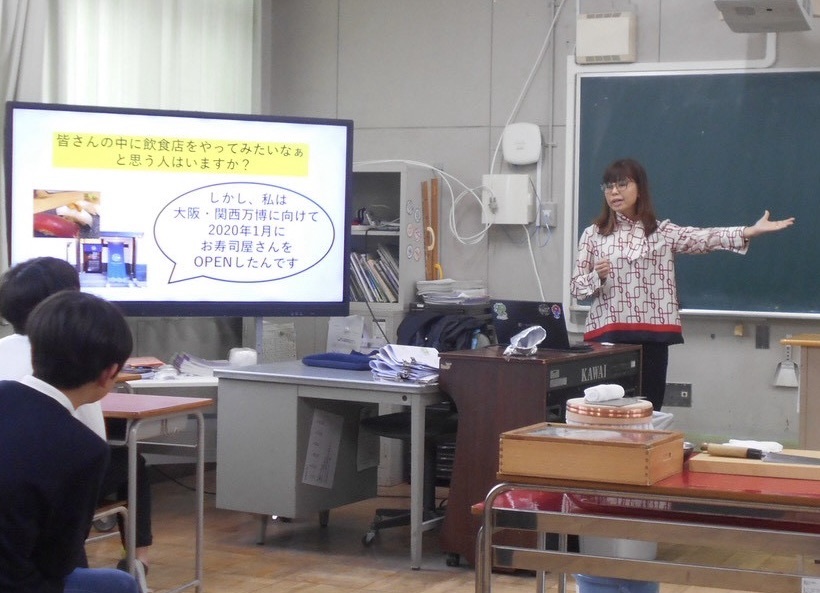 教室では牧さんが「飲食店の10年後の廃業率」を示し、90%という高さに子どもたちが驚く。よく透る声とひきつける話術、どんな答えにも褒めるコメントで返す瞬発力がすごい。教員も勉強になったと思う。