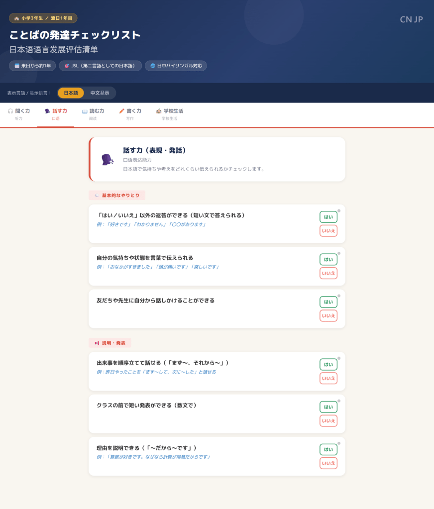 最後にちょっとだけ入った生成AI活用の話を聞きながら、自分のPCだったので「ことばの発達と習得のものさし」を「中国から来て1年の小学校3年生向けのチェックテストにして」とClaudeに入れるとあっという間にテストを作ってくれた。現場が助かるツールがどんどん作れる。